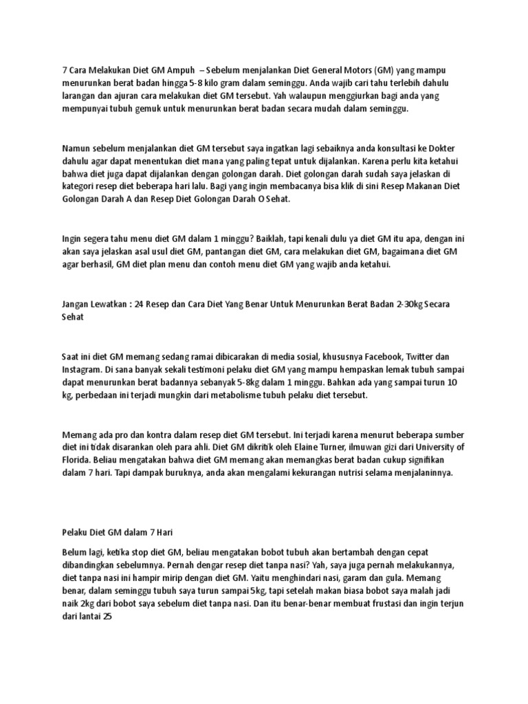 Banyak orang yang tertarik untuk mencoba diet gm ini karena hasilnya cukup efektif dapat menurunkan berat berat 5 8 kg dalam satu minggu. Setiap harinya menu yang harus dimakan pelaku diet gm sudah ditentukan dan harus ditaati agar hasilnya maksimal. Berbeda dengan program diet lain yang cenderung lebih menyiksa karena harus sering menahan lapar diet gm justru sebaliknya.