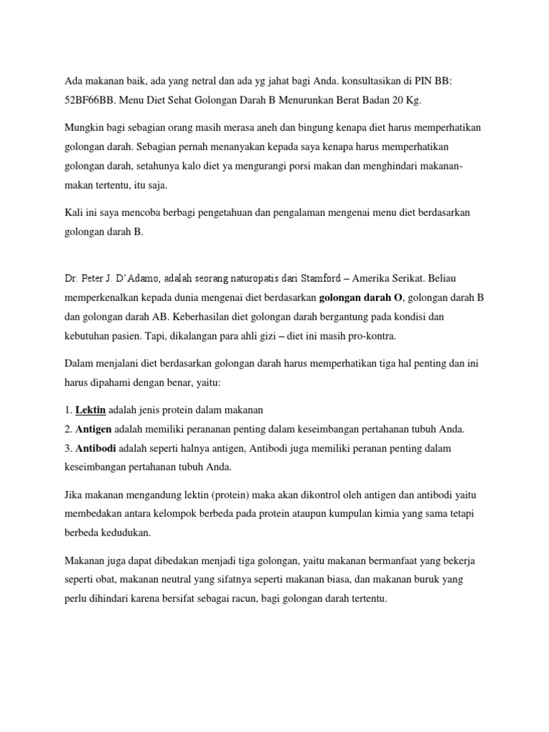 Korelasi antara diet dengan golongan darah seseorang pertama kali diperkenalkan oleh dr. Banyak jenis diet yang terkenal di masyarakat indonesia salah satunya diet sesuai dengan golongan darah. Menu diet golongan darah b seminggu yang paling efektif dalam menurunkan berat badan adalah makanan yang diolah tanpa minyak.