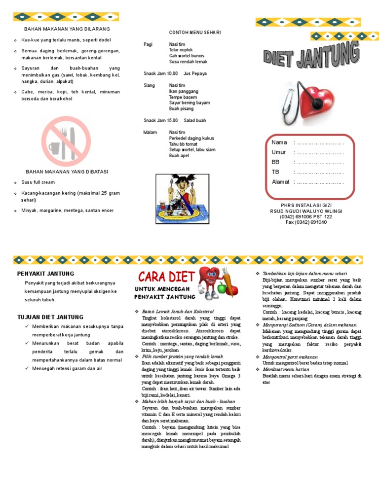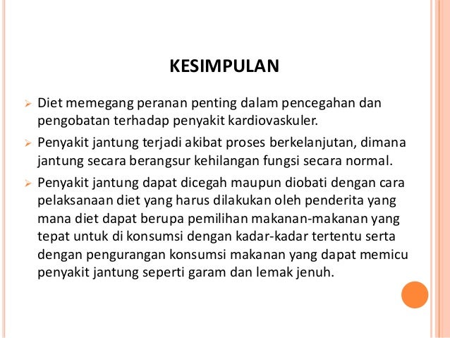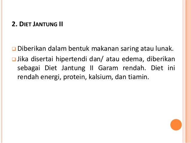 Meski pasien penyakit jantung memiliki banyak pantangan makanan dan minuman namun bukan berarti menu diet sehari hari harus membosankan. Diet jantung ii makanan diberikan secara berangsur dalam bentuk lunak setelah masa akut mci dapat diatasi menurut beratnya hipertensi atau oedema yang menyertai penyakit makanan yang diberikan rendah garamdiet jantung ii rendah garam makanan ini rendah kalori protein kalsium dan thiamin. Secara langsung dan tidak langsung munculnya penyakit jantung in mumcul.
