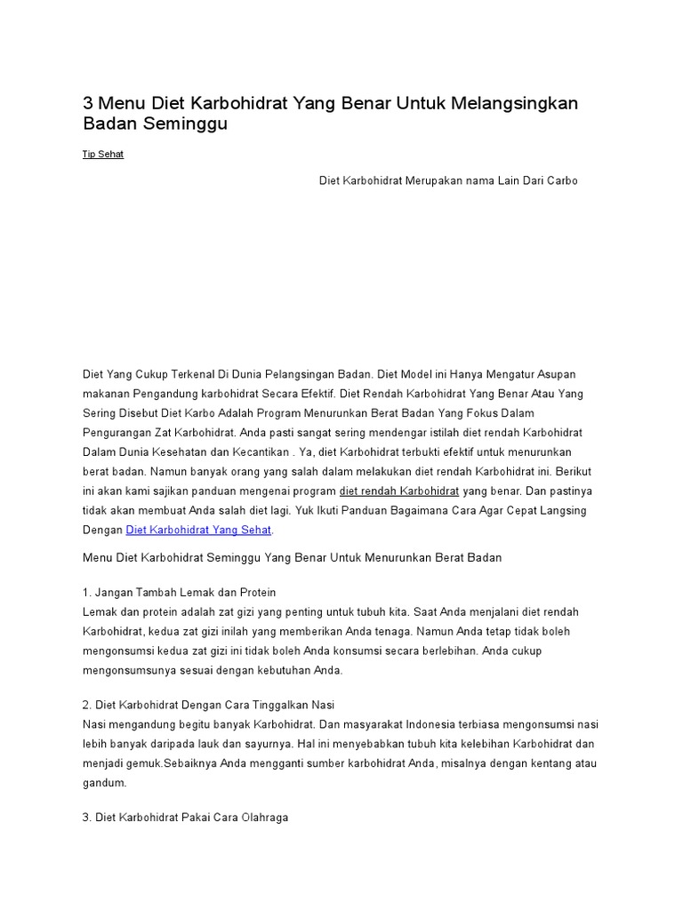 Untuk menu diet karbo sederhana dibawah ini bisa total mencapai 50 gram karbohidrat saja perhari. Berikut ini kami berikan contoh menu diet karbo 1 minggu bagi anda semua. Tak dipungkiri untuk wanita memiliki tubuh langsing nan sexy menjadi impian atau target di semasa hidupnya.