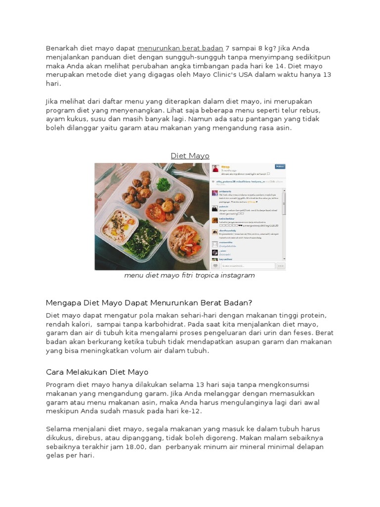 Program diet ini terbukti ampuh dan sudah banyak teruji mampu menurunkan berat badan berlebih dari 7 hingga 8 kilogram dalam jangka waktu cukup pendek. Resep menu diet mayo 13 hari turun 8 kg diet mayo adalah salah satu diet yang sedang trend di berbagai kalangan masyarakat luas. Para artis artis indonesia juga banyak sekali yang menjalankan diet mayo seperti melly goeslaw fitri tropica mona ratuliu dan lain sebagainya.
