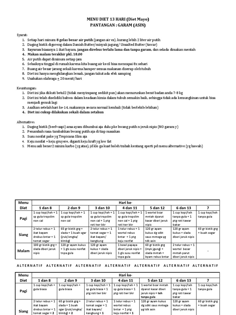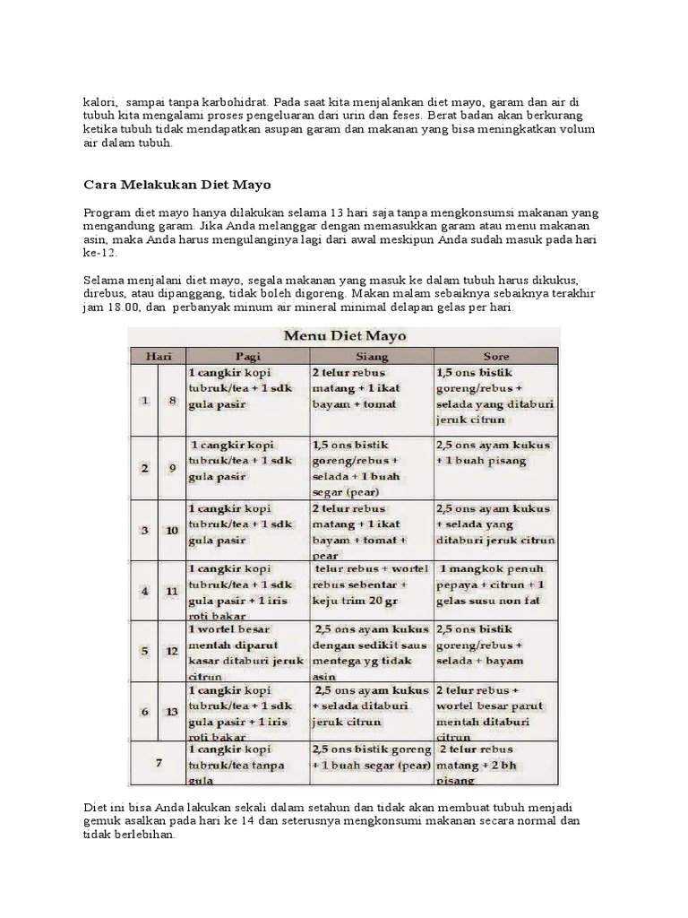 Hari ke 1 dan 8 sarapan1 cangkir kopi tubrukteh 1 sdk gula pasir makan siang. Diet mayo adalah merupakan cara diet cepat dengan tidak menggunakan garam pada setiap makanan yang dikomsumsi. Aturlah menu diet mayo 14 hari sesuai keinginan anda dengan mengikuti aturan diatas.